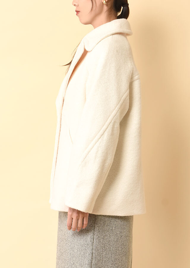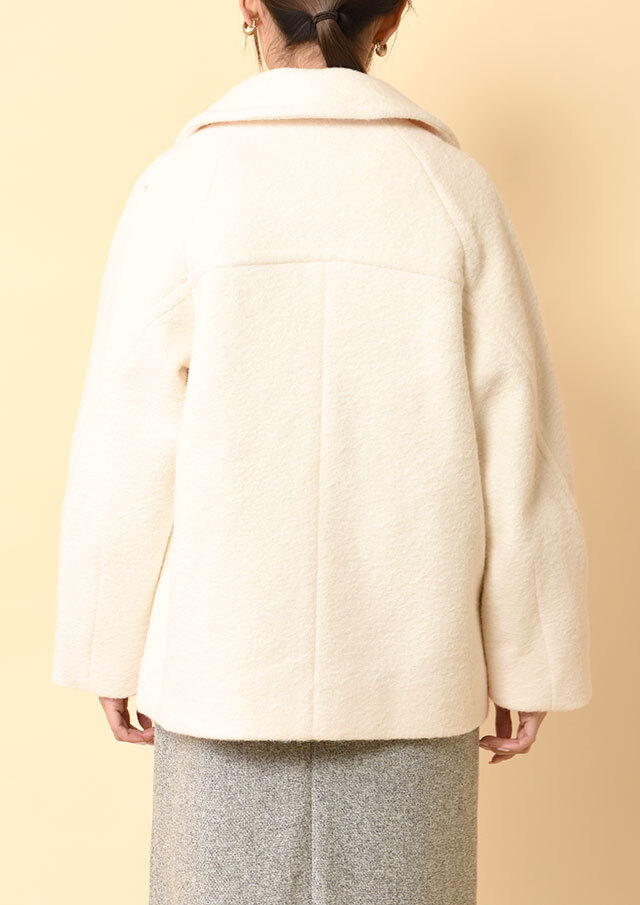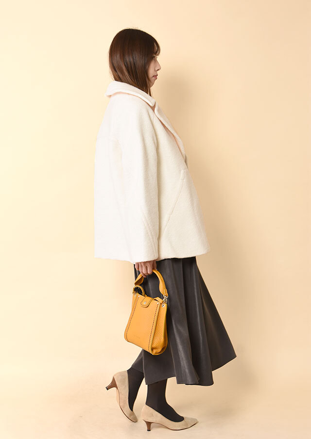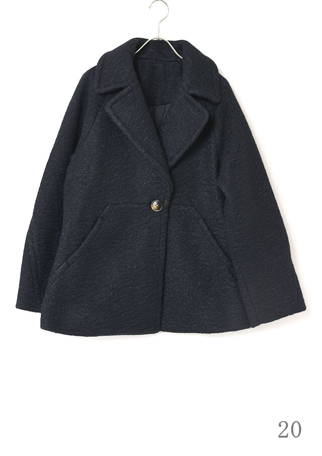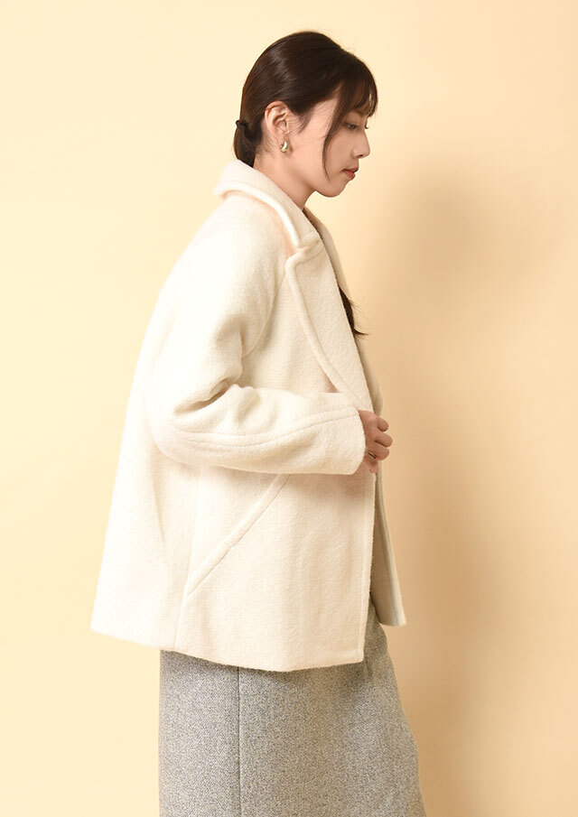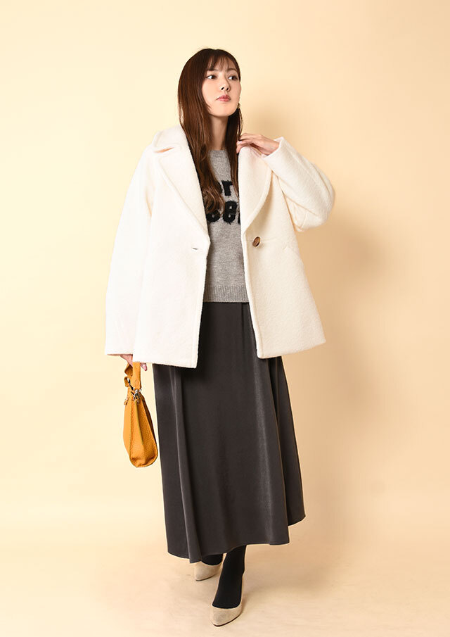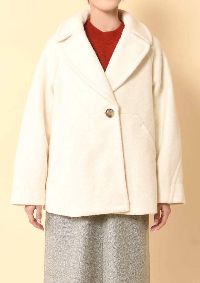 クラシックなPコート風のミドルコートは、裾にダーツを入れることで大人の女性らしいコクーンシルエットを実現。