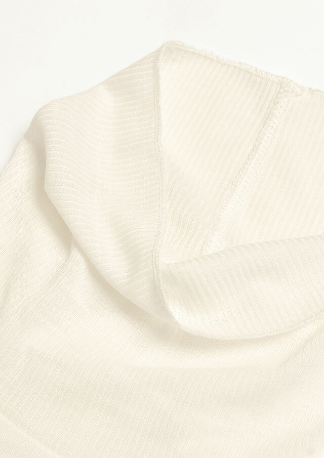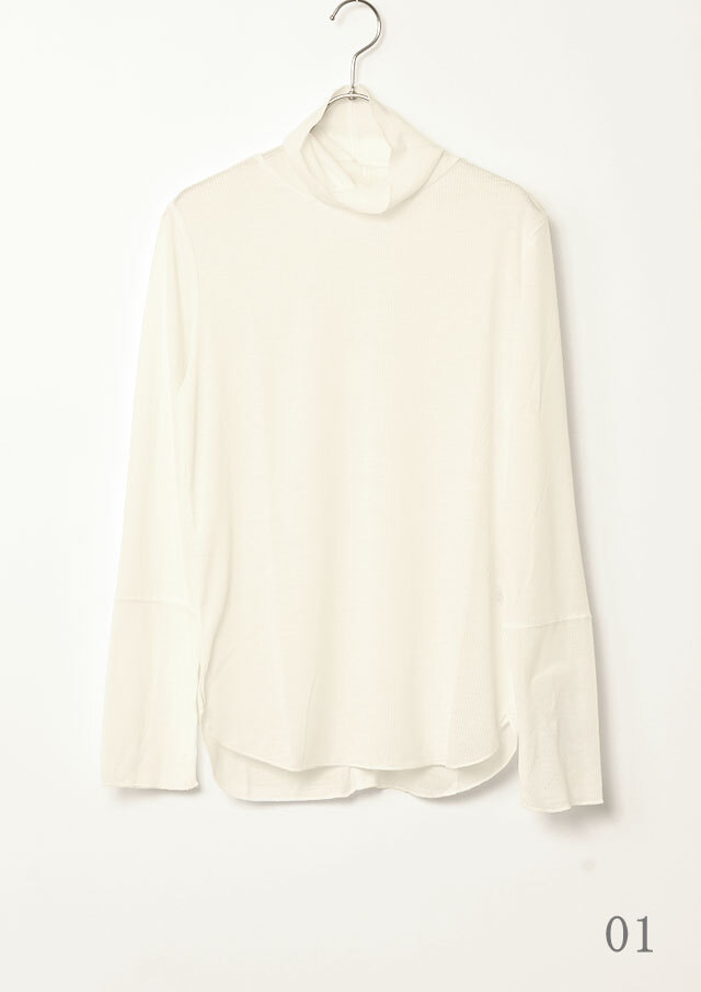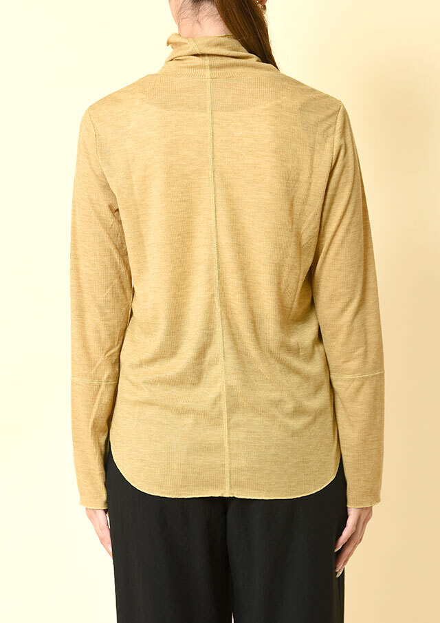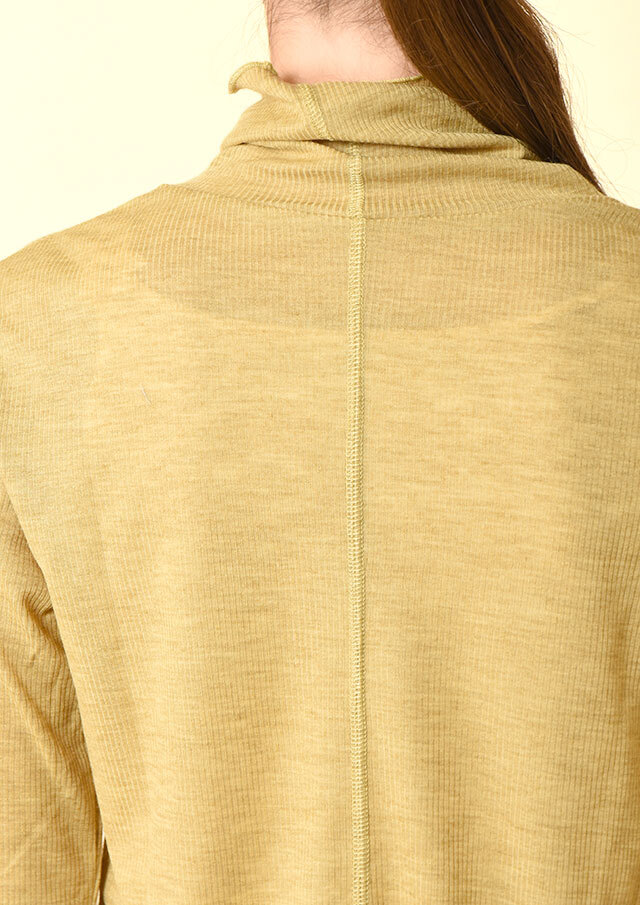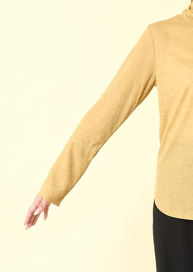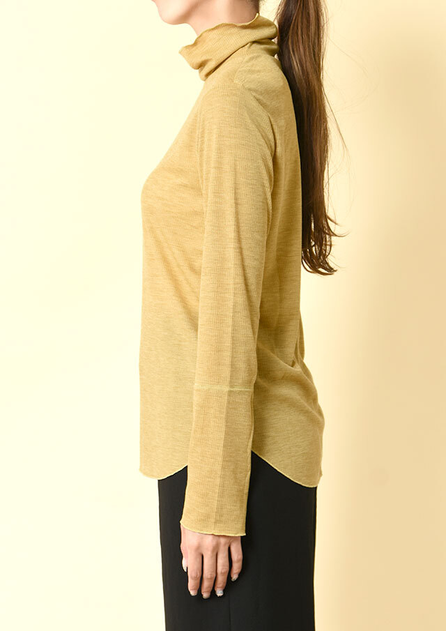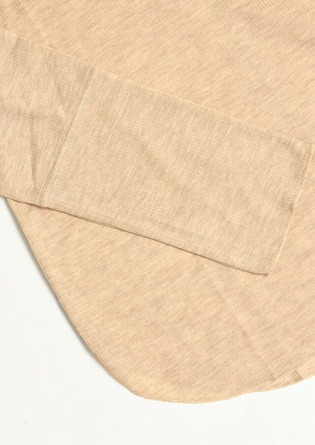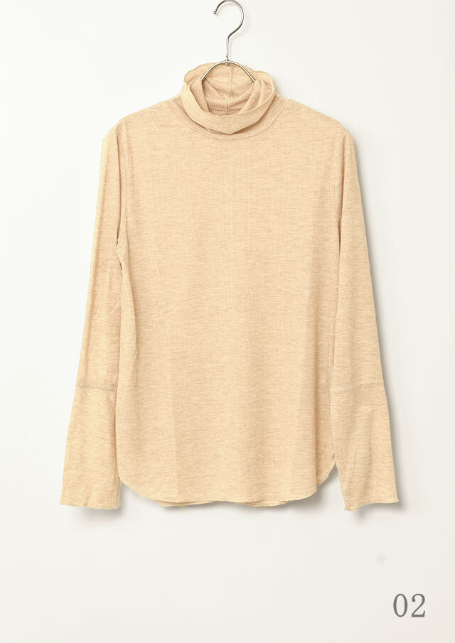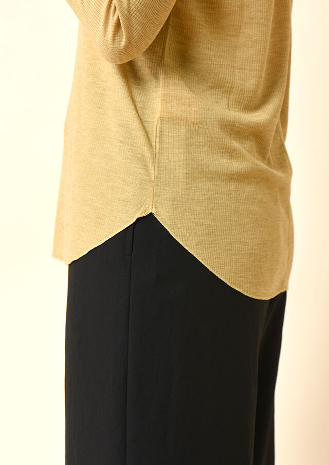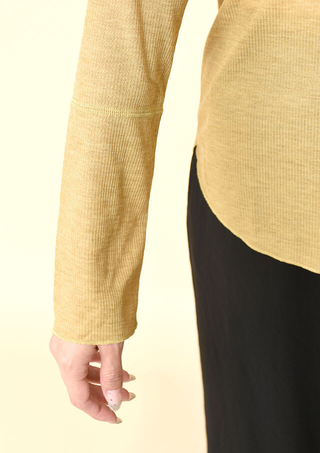 カジュアルな表情のメランジ糸を使用したリブ編みで季節感がありつつも、薄手の肉感で今時期から着やすいプルオーバー。