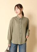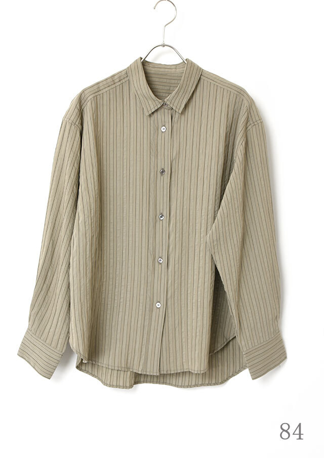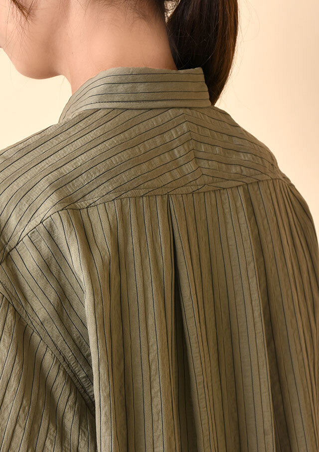 シンプルなシャツカラーながら、素材の表情とドレープが際立つ一枚。