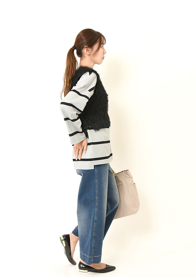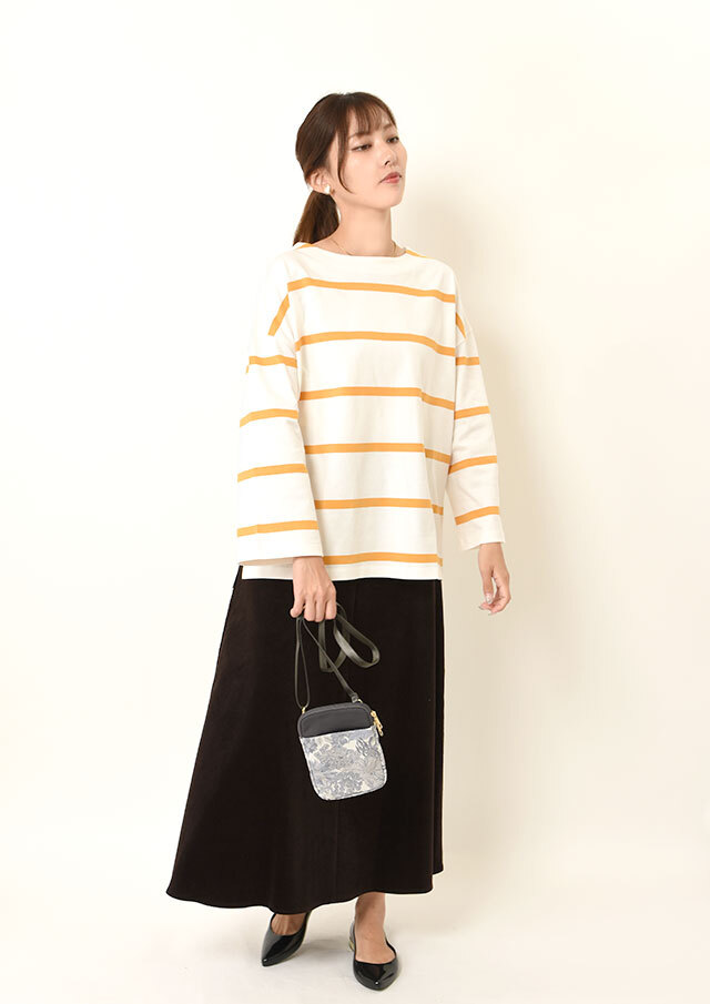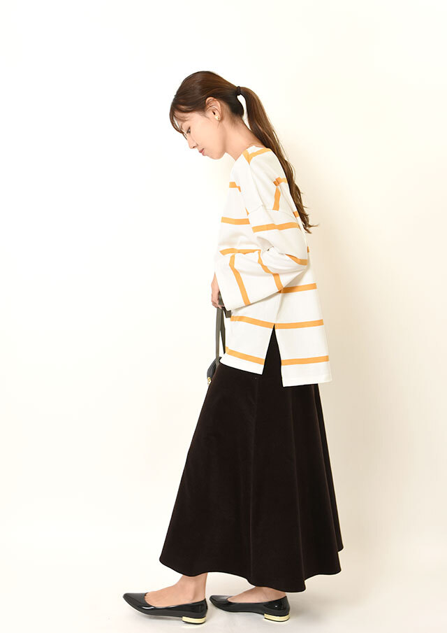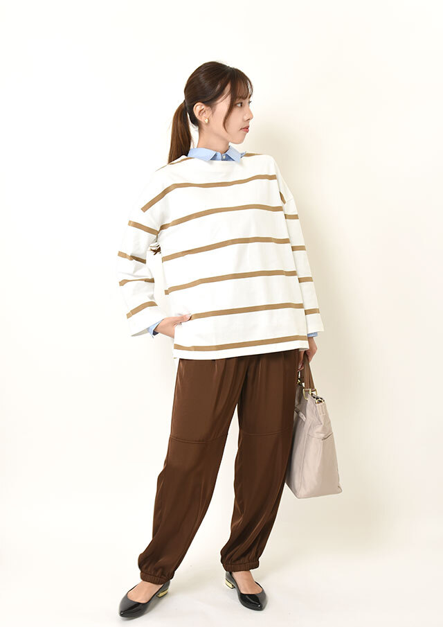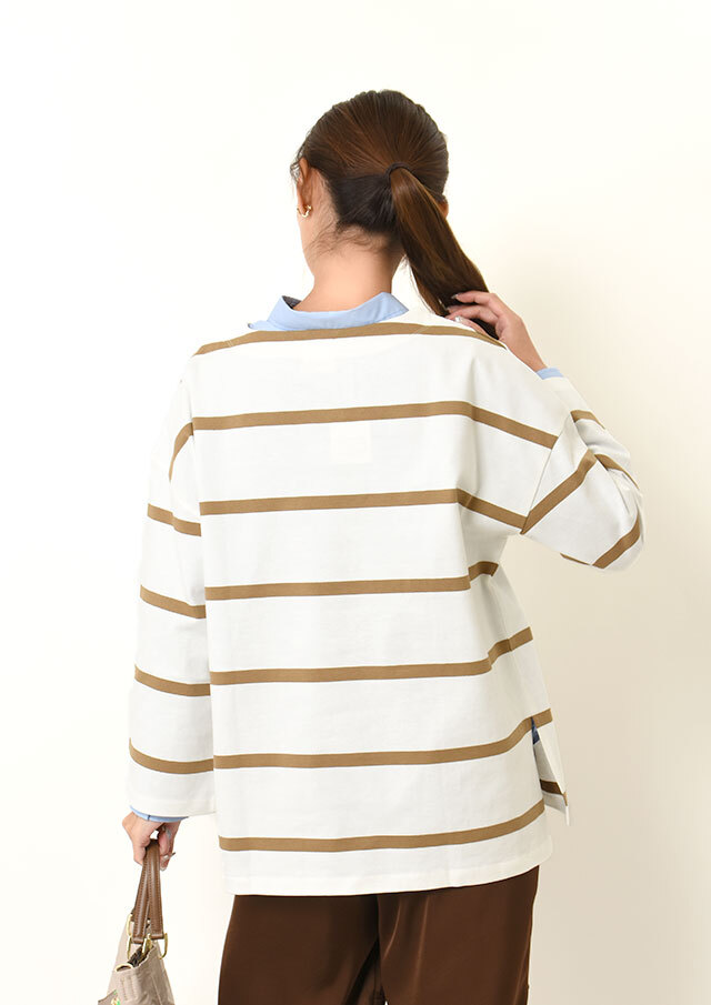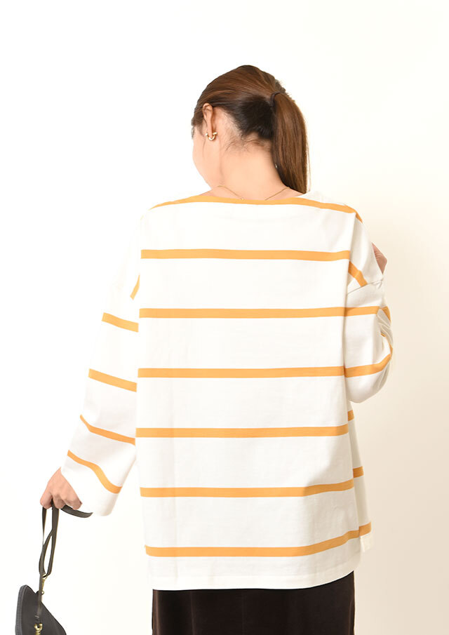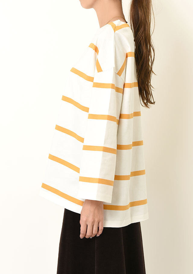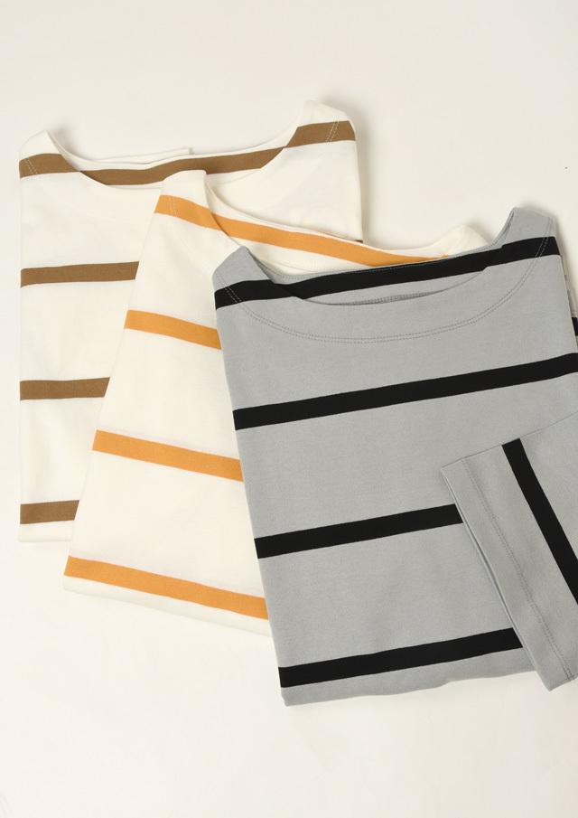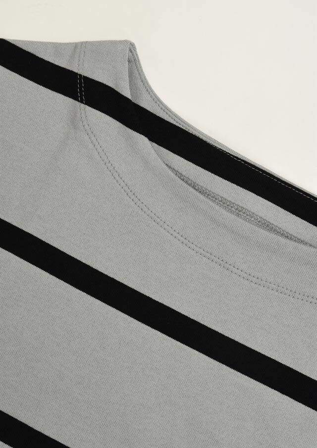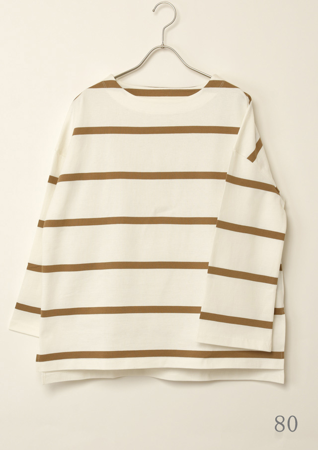 大人っぽいピッチのボーダーを全面に配し、顔周りをすっきり見せる浅めのネックラインがポイント。