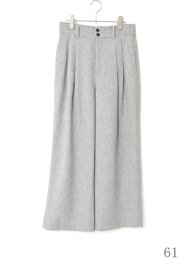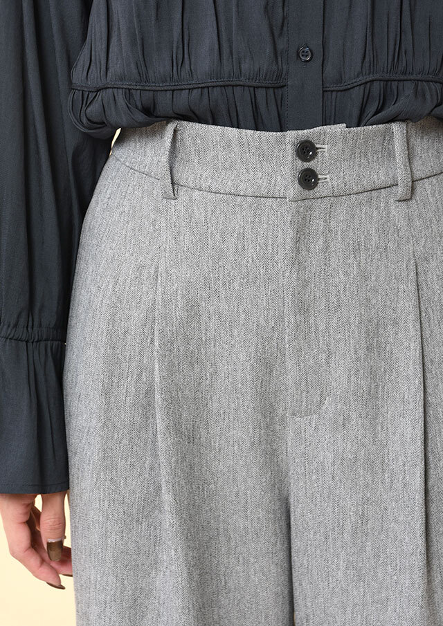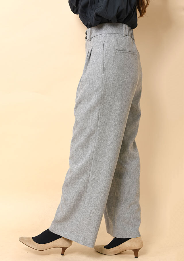 スッキリとした腰まわりから緩やかに落ちるワイドシルエットが、脚のラインを美しく演出します。