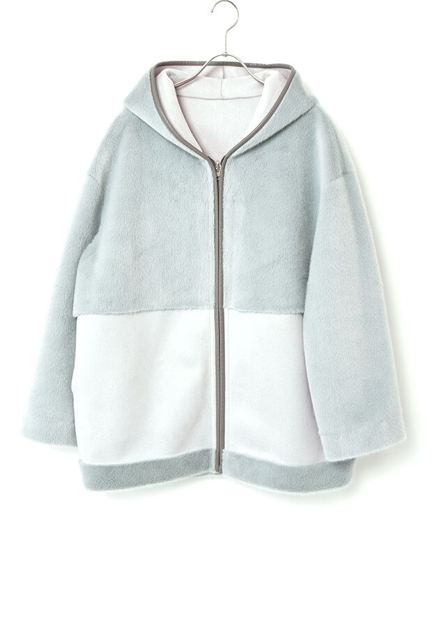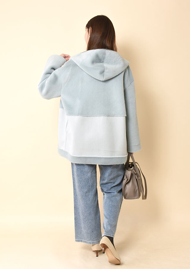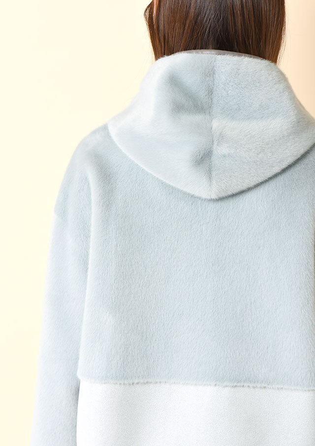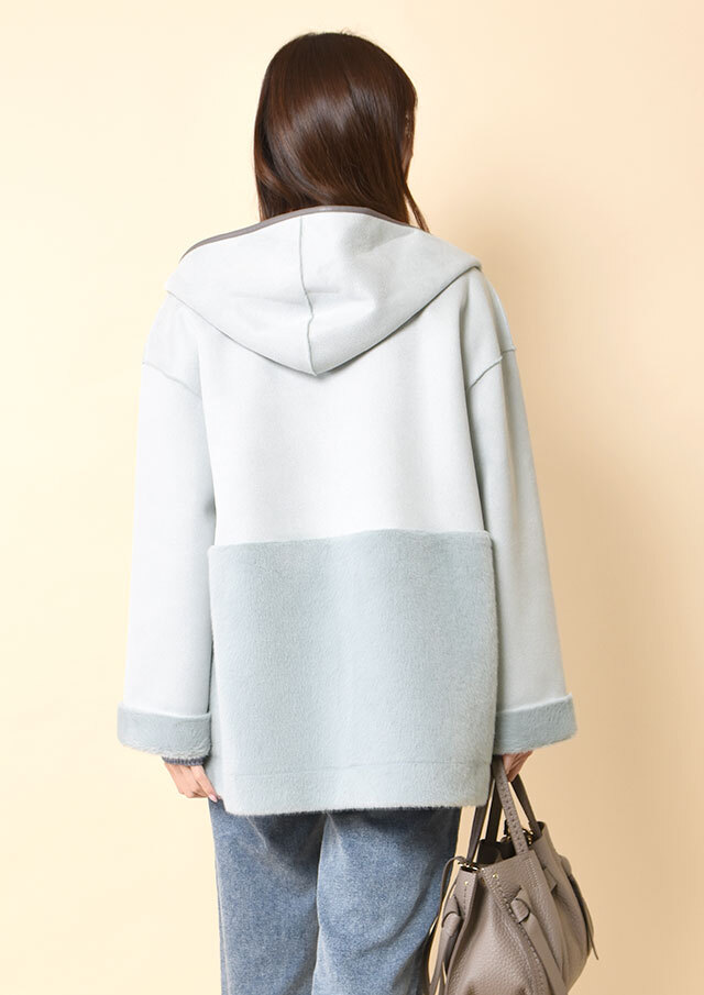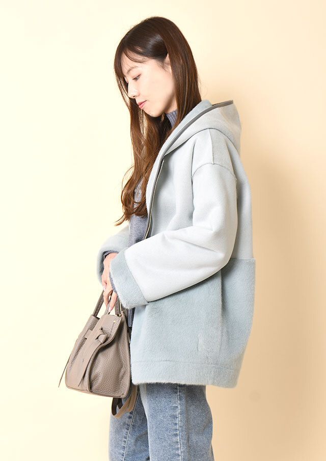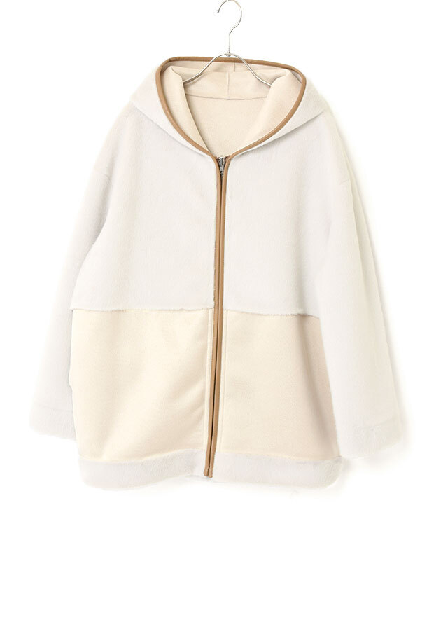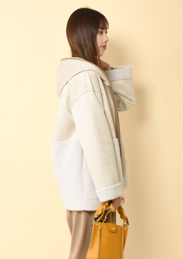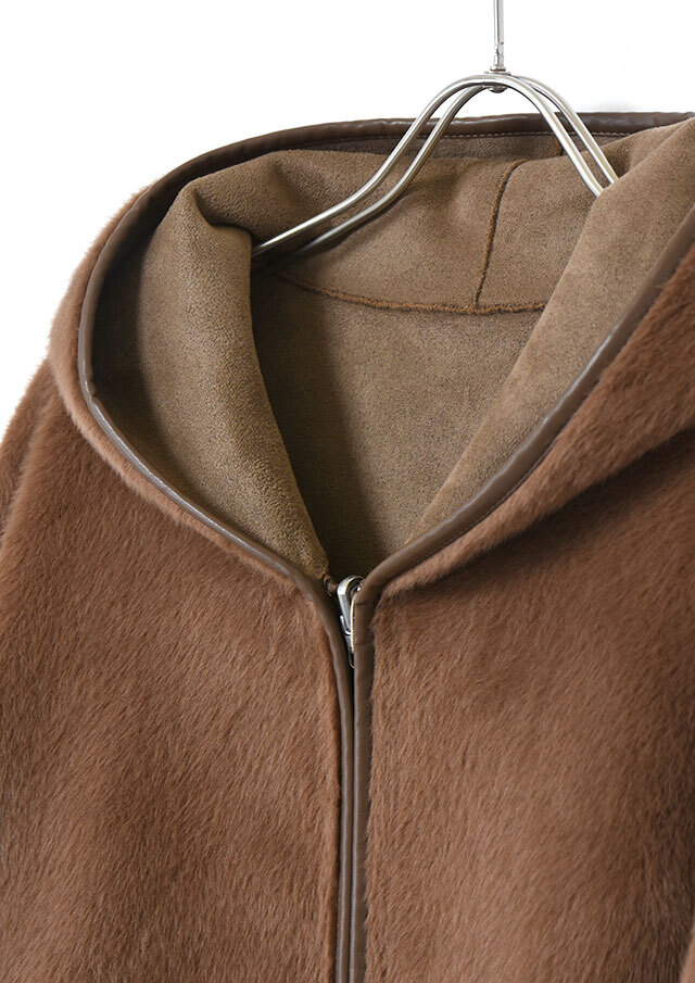 ファスナーとフード端には合皮のパイピングを施し、やわらかな素材感の中にさりげないアクセントを添えています。