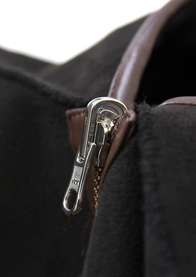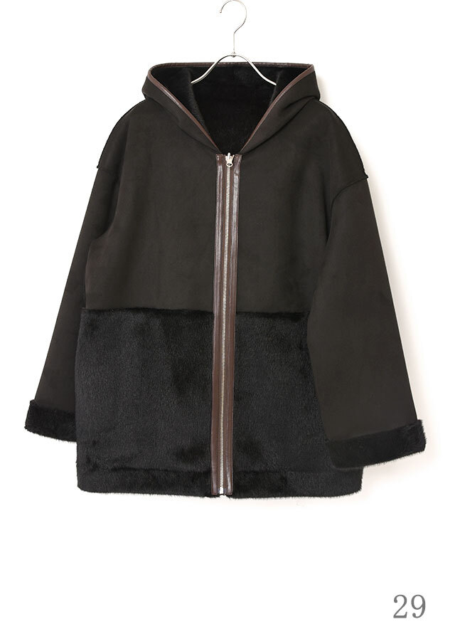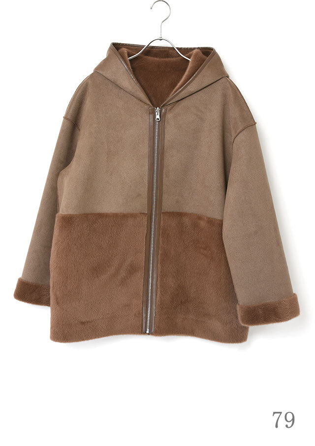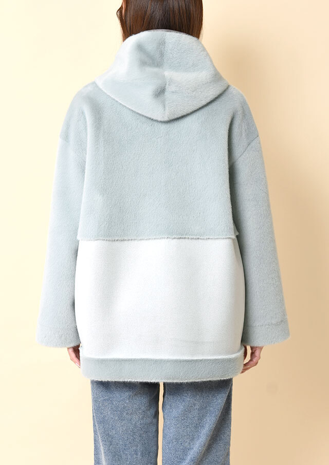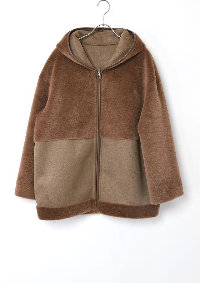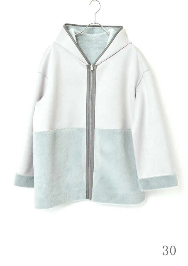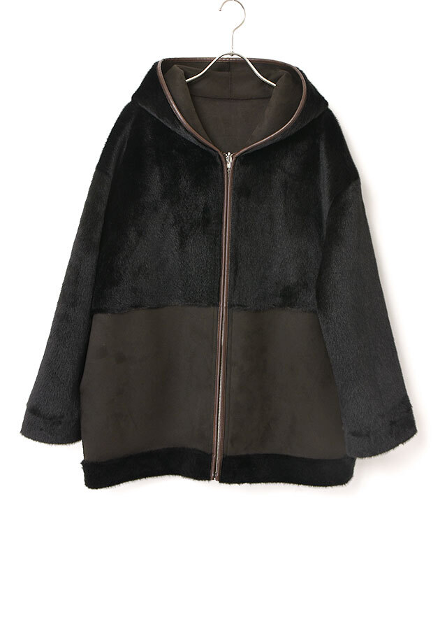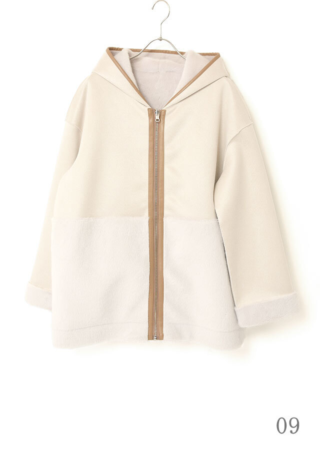 ファスナーとフード端には合皮のパイピングを施し、やわらかな素材感の中にさりげないアクセントを添えています。
