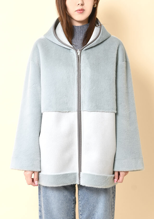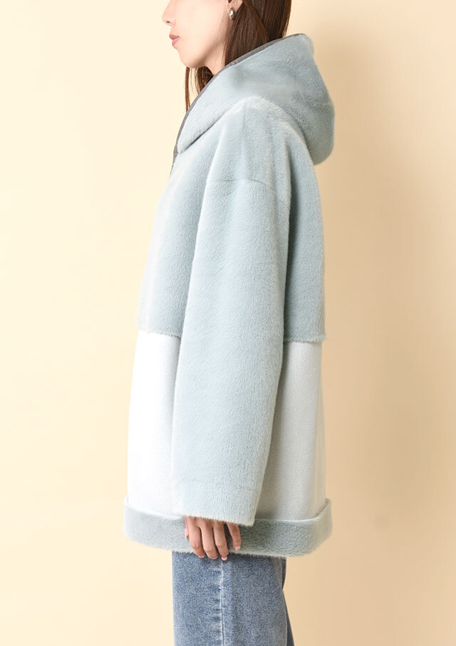 冬らしいウォーム感を感じさせる、ありそうでなかった異素材コンビデザインのフーデッドコート。