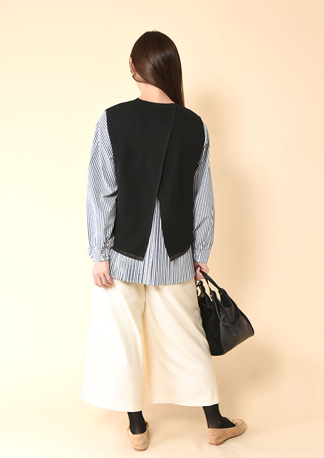 センターシームが縦ラインを作るので、ワイドシルエットながらもスッキリとした印象です。