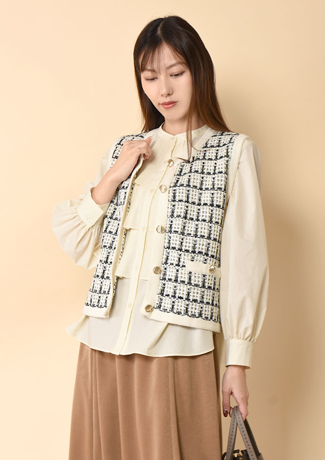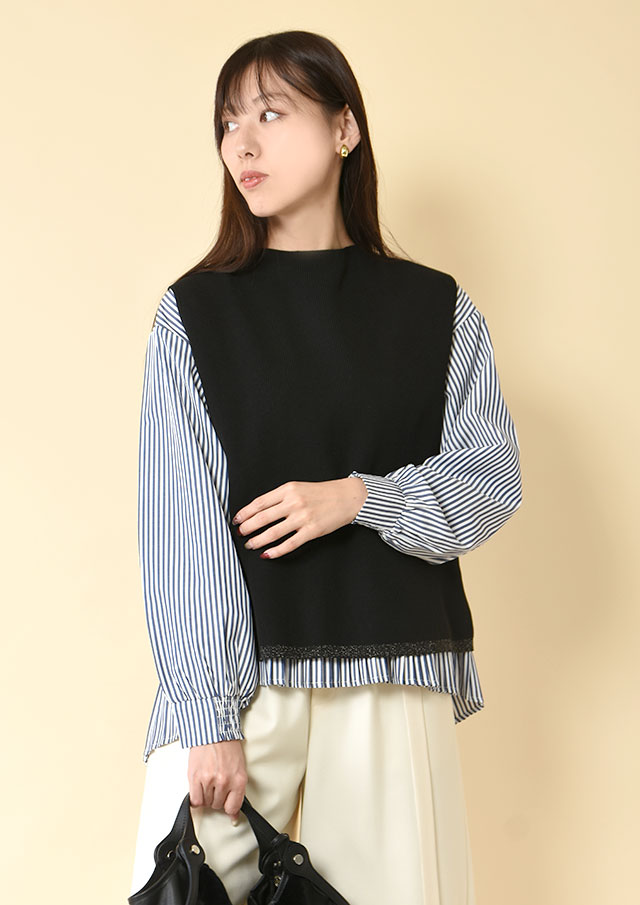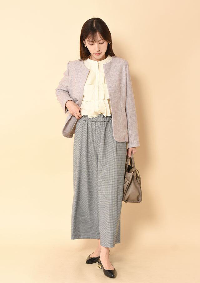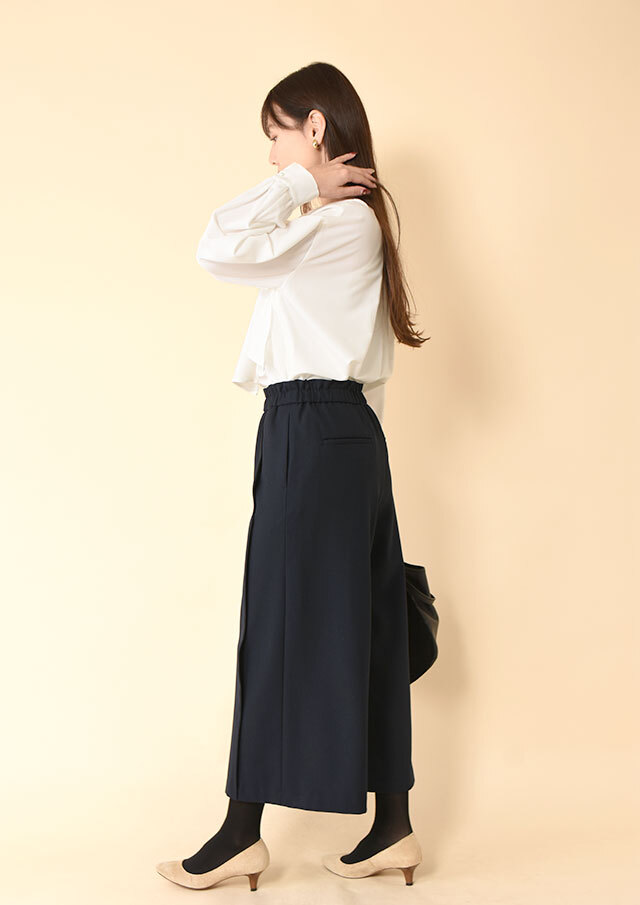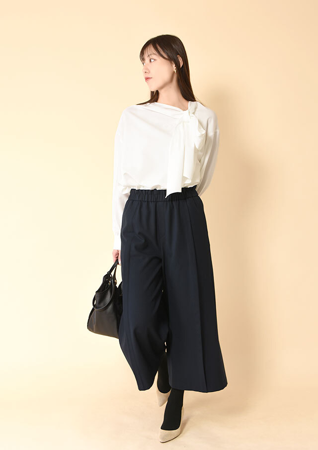 シンプルなニットやブラウスを合わせるだけで、バランスの取れたスタイリングに。