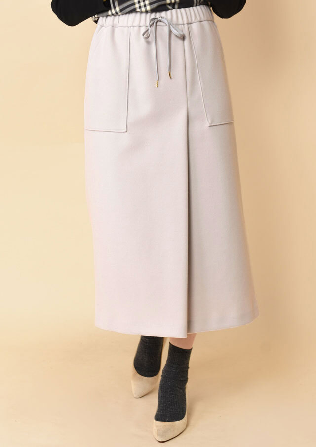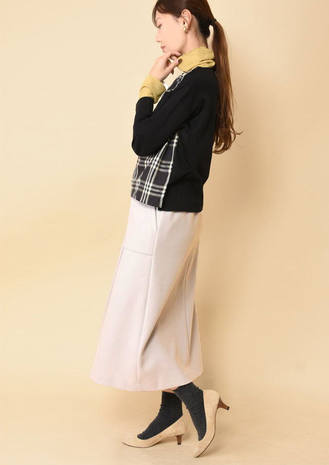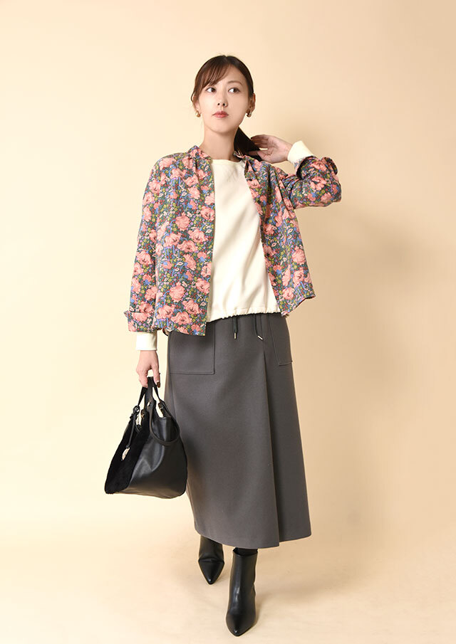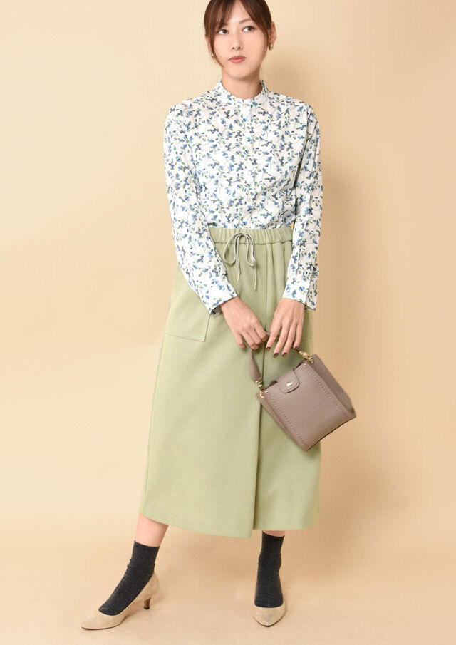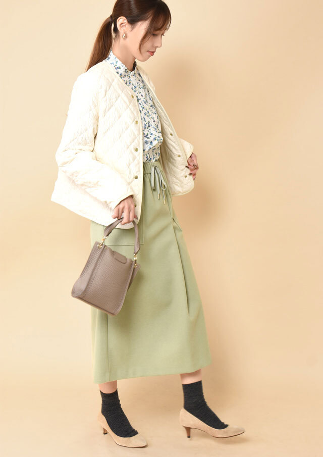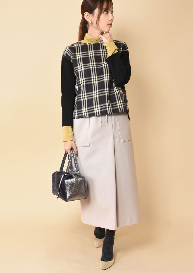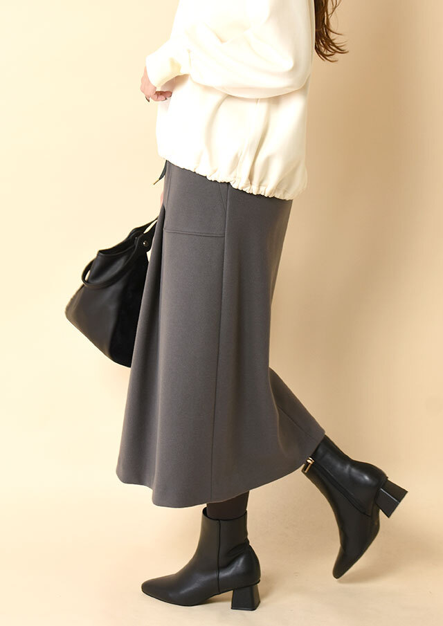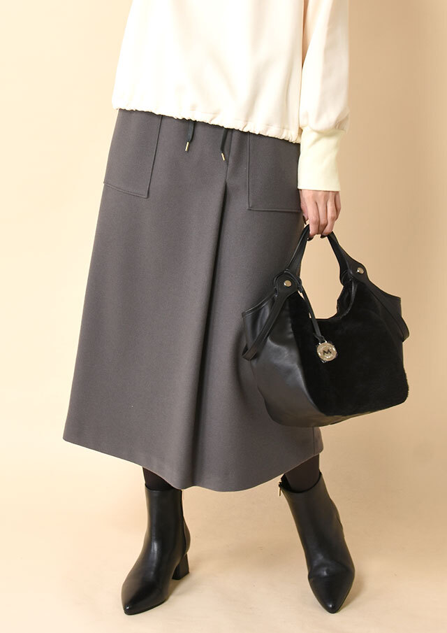 落ち着いたトーンのスカートなので、マフラーやバッグで季節感ある色を差すと、控えめな華やかさを添えることができます。