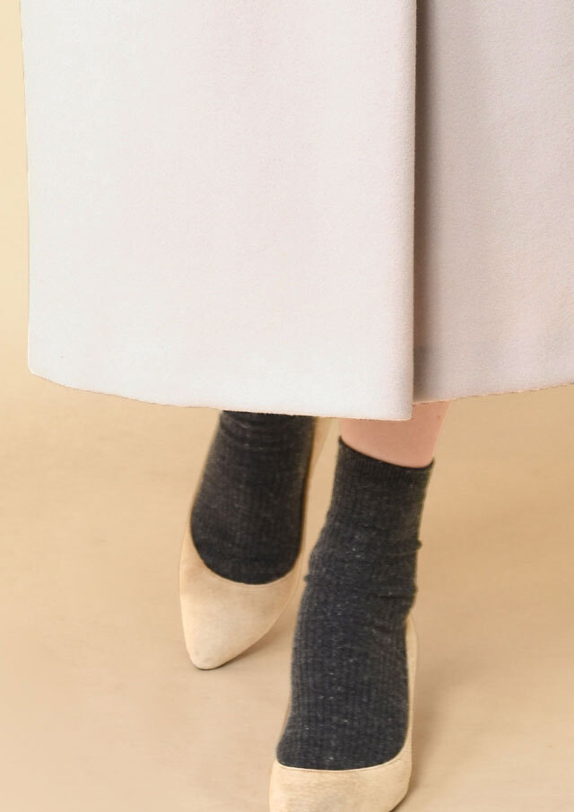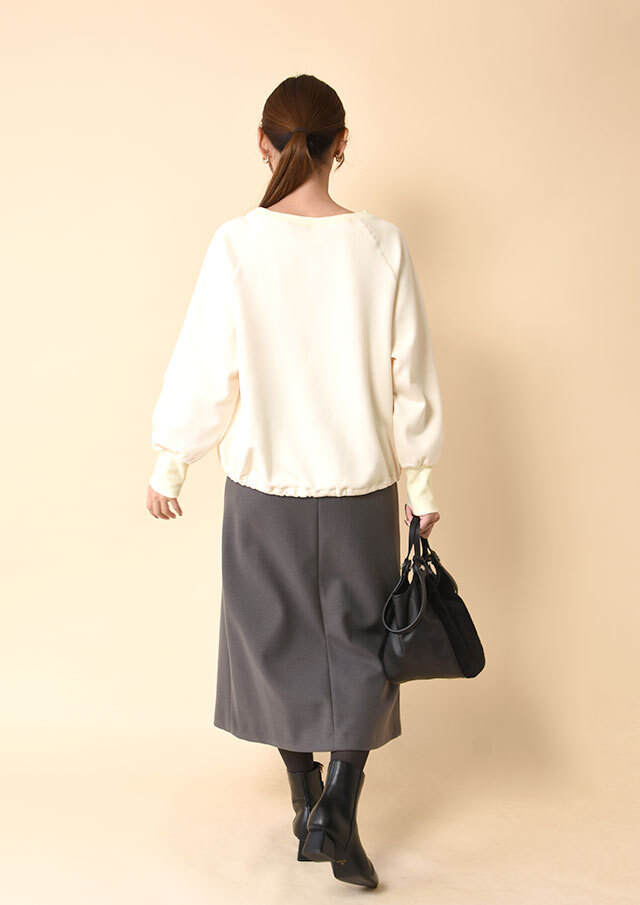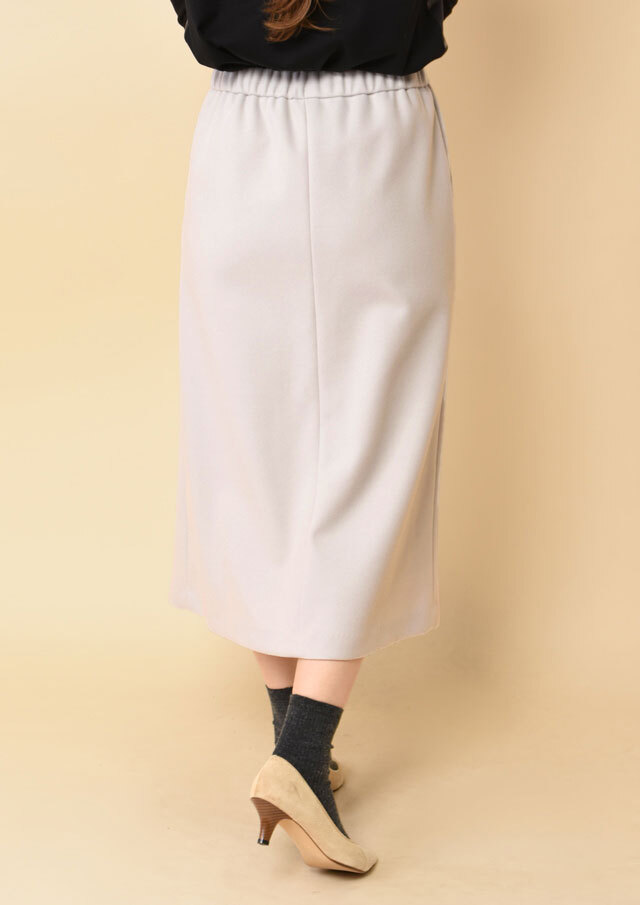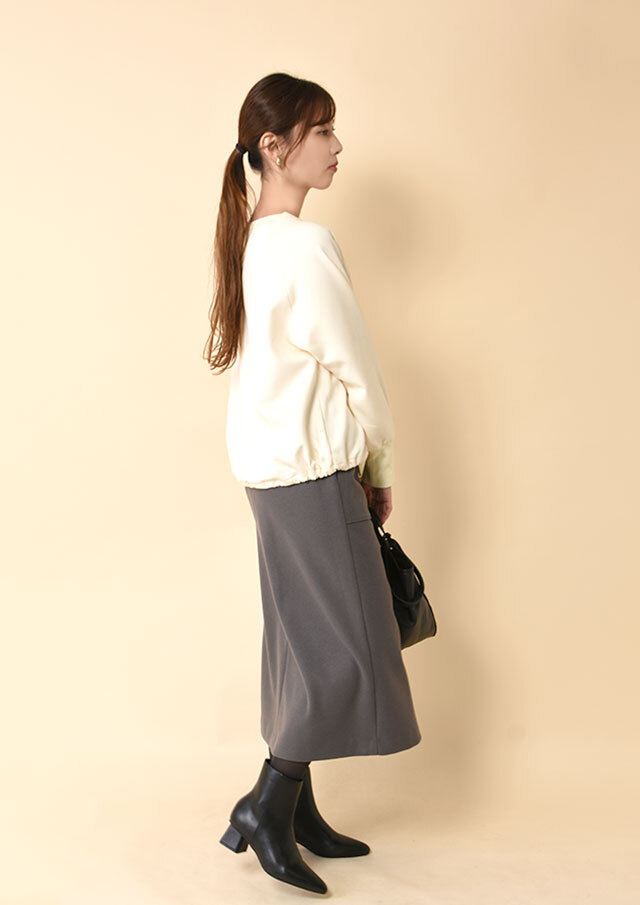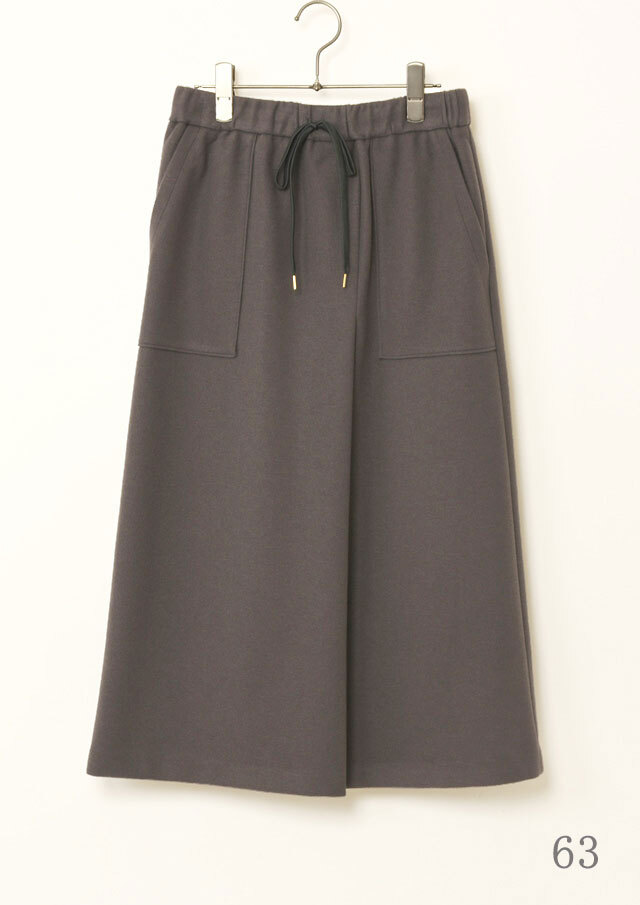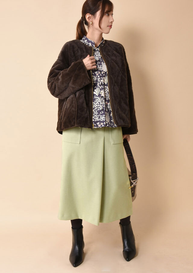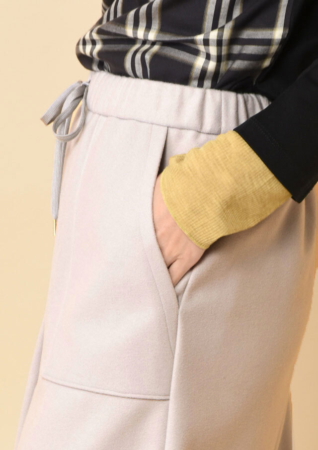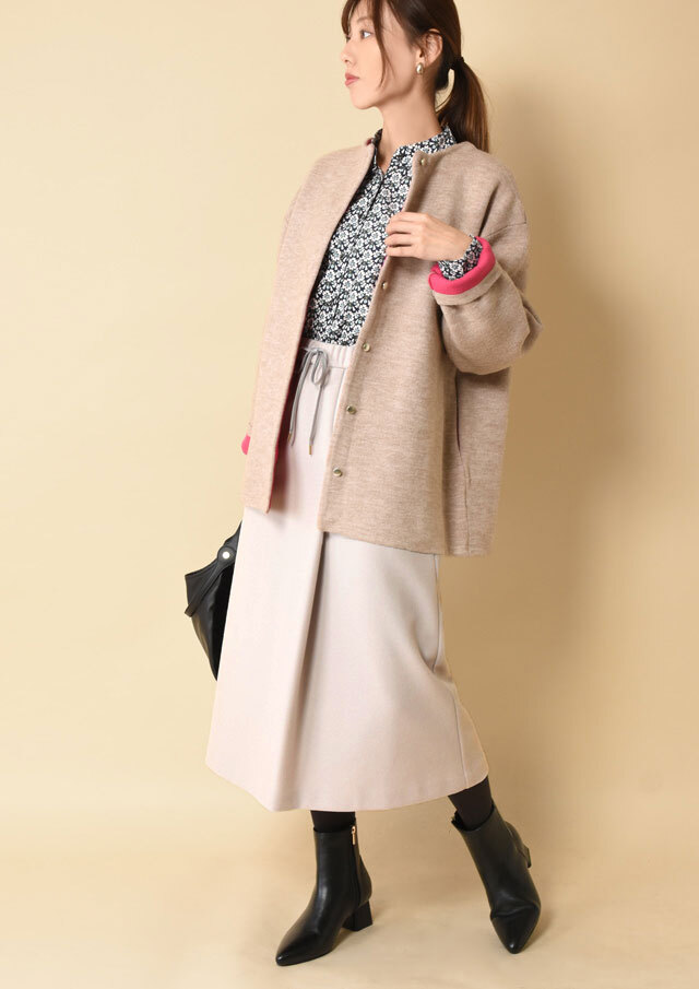 落ち着いたトーンのスカートなので、マフラーやバッグで季節感ある色を差すと、控えめな華やかさを添えることができます。