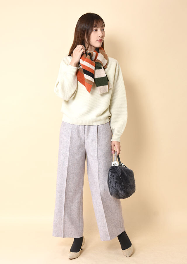 編み目がフラットなので、巻き方によってスッキリにもボリューミーにも巻くことが出来ます。