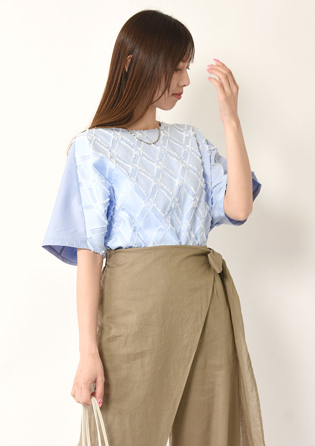 フロントにラップ風の生地を重ねた、動きのあるデザインが印象的。