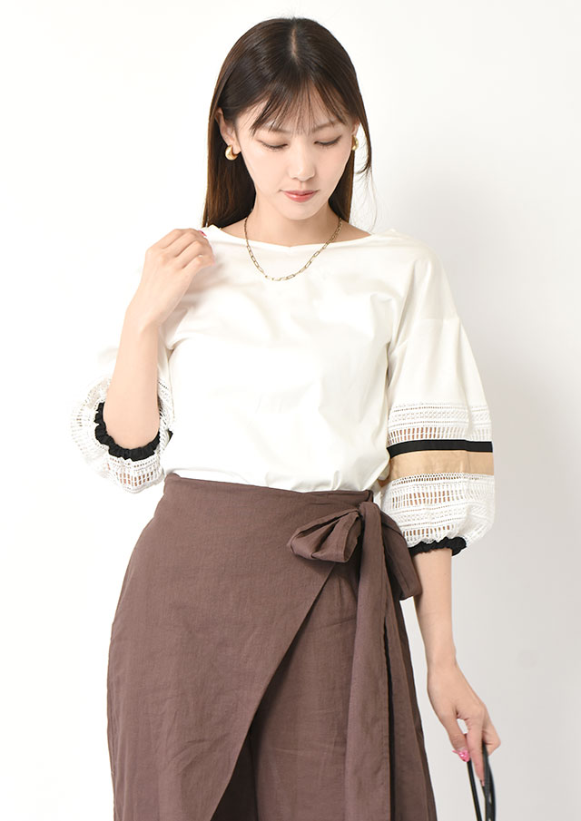 コンパクトなカットソーをインして、ラップデザインとリボンを主役にした着こなしが印象的。